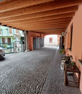 Entrati nella corte mediante l'apertura di un cancello elettrico e attraversato un porticato condominiale, si accede ad una scala con ascensore che consente l'accesso ai due piani superiori dell'edificio. Giunti al piano secondo si precedere per un passaggio comune fino all'ingresso dell'abitazione. L'unità residenziale è composta da un ambiente giorno soggiorno-cucina, due camere e un bagno, dotato di finestra tipo velux. Pertinenze dell'unità residenziale sono un piccolo ripostiglio al piano secondo, posto in prossimità dell'arrivo delle scale condominiali, una cantina e un garage al piano interrato.