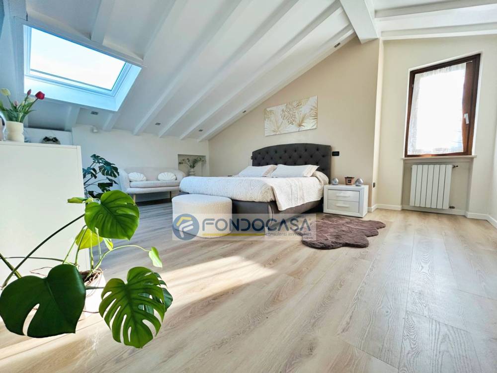 Una scala interna conduce al piano superiore, dove si sviluppa la splendida camera padronale con travi a vista, dotata di guardaroba e bagno dedicato.