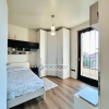 The residence, distinguished by bright interiors and refined finishes, comprises on the first floor a welcoming living area with open-plan kitchen, enhanced by large windows opening onto a spacious, livable balcony. A hallway leads to the bedroom with private balcony and a windowed bathroom.