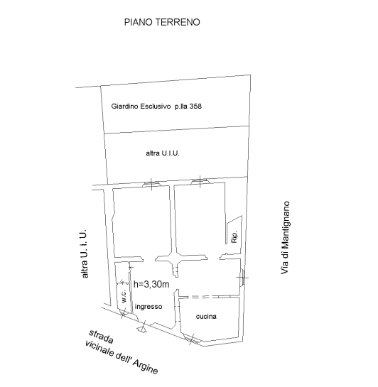 Unità immobiliare destinata attualmente ad uso residenziale, su unico livello, piano terreno, con ingresso indipendente facente parte del complesso immobiliare, composta da ingresso, cucina, disimpegno, ripostiglio, due camere da letto, un bagno nonché giardino esclusivo sempre al piano terreno, distaccato dall'abitazione,
