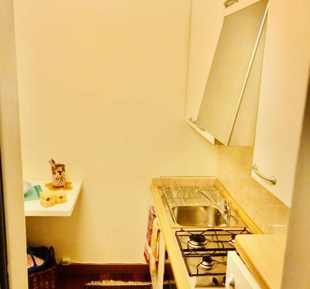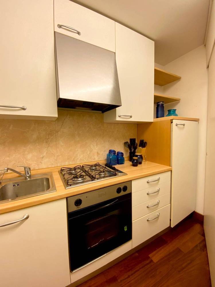 La zona giorno è completata da un angolo cottura, perfetto per le esigenze di un single o di una coppia.