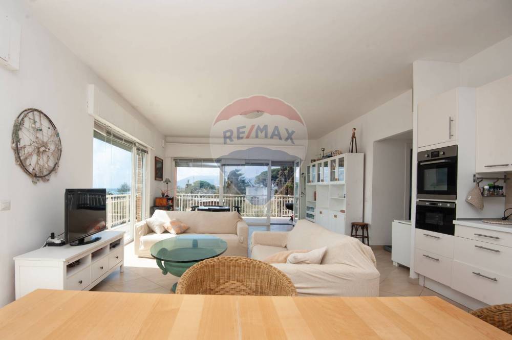 L'ingresso si apre su un ampio soggiorno con vetrate panoramiche ed una suggestiva vista mare che abbraccia l'intera baia arrivando a comprendere le isole pontine e, nelle giornate più terse, anche l'isola di Ischia. Un ambiente open space che include salotto, sala da pranzo ed una moderna cucina a vista, progettato per godere appieno del panorama.