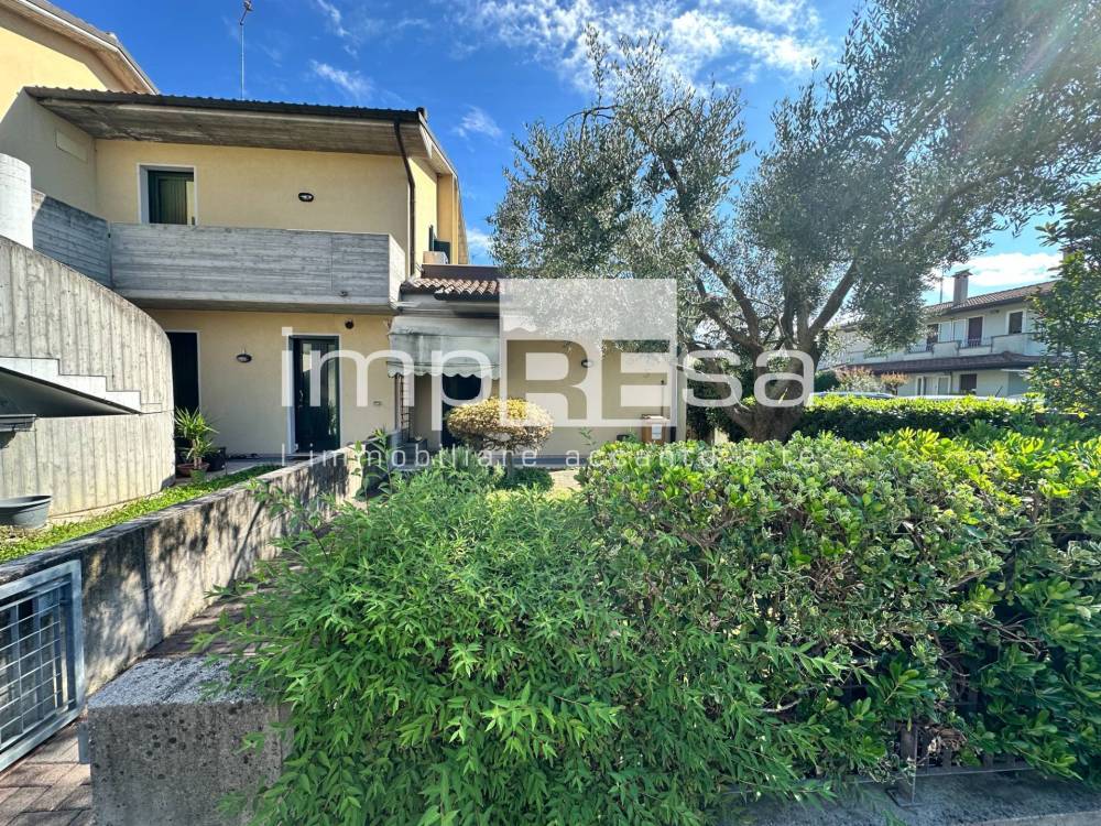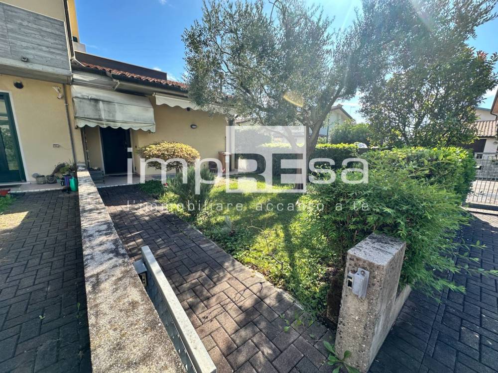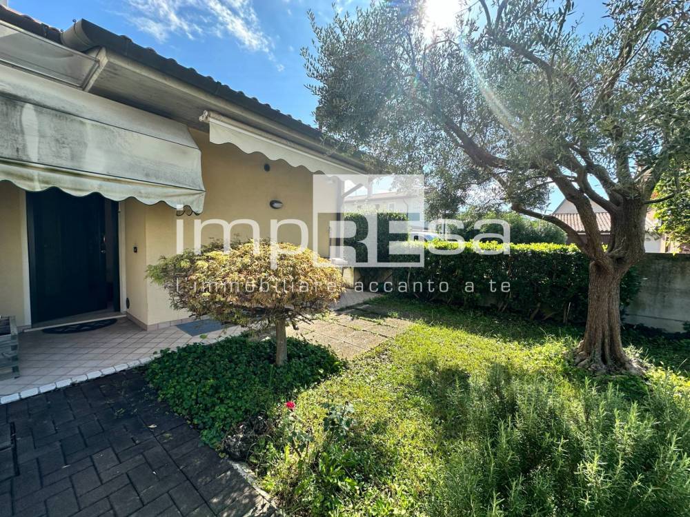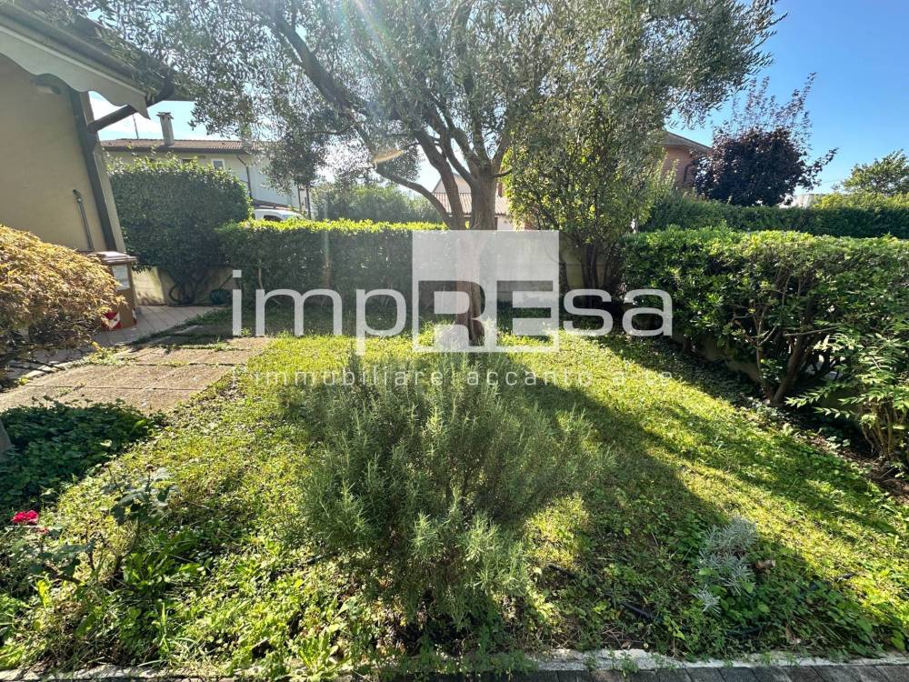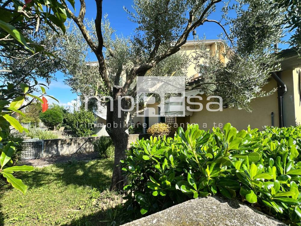 All'esterno giardino di proprietà di mq. 60, piantumato con alberi e siepe perimetrale e completo di tenda parasole esterna e pavimentazione.