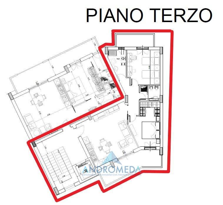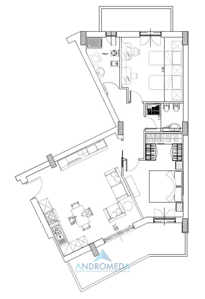 L’ appartamento si compone di: ampio salone living con cucina a vista, due camere da letto e due bagni.