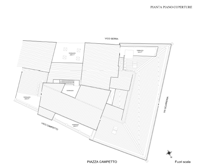 Piano coperture: falde del tetto e terrazzino. Attualmente le attività di vendita, magazzino, esposizione occupano la maggior parte del piano terreno, primo e locali su via Scurreria.