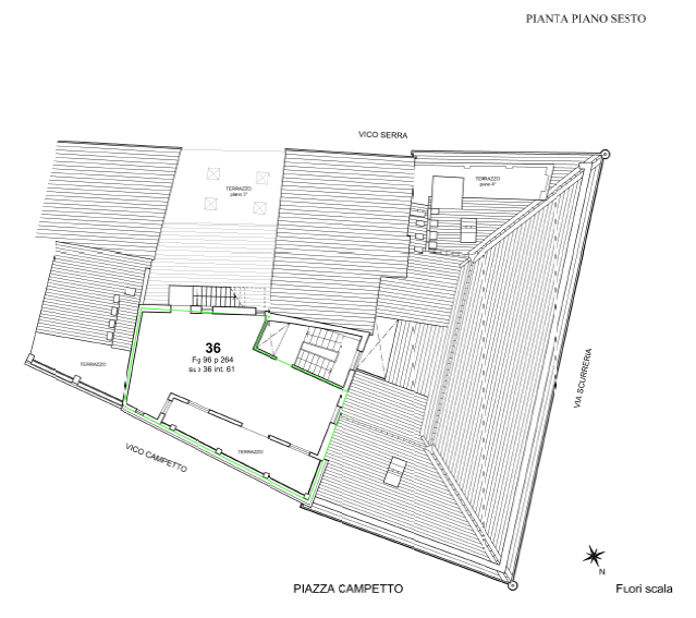 Piano sesto: n. 1 locale con terrazzo, scale, vuoto ascensore, scaletta di accesso al terrazzino in copertura;