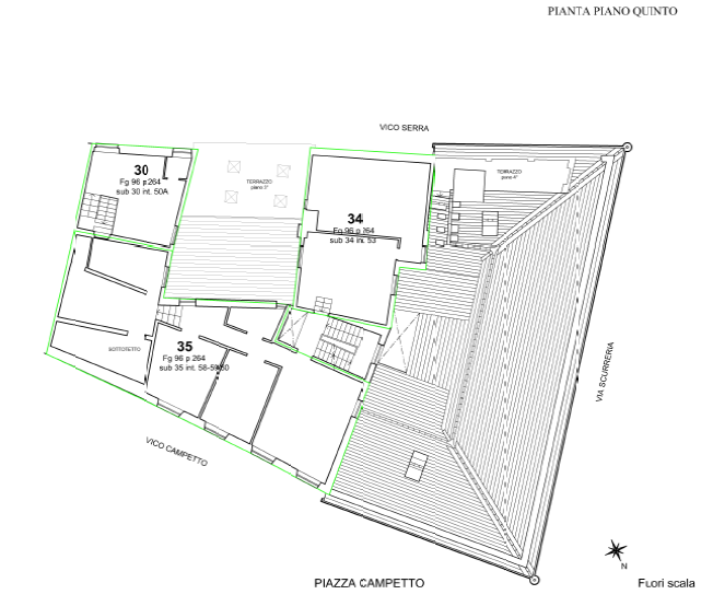 Piano quinto: n. 6 locali, soffitte, disimpegni e accessori diversi, scale e vuoto ascensore e terrazzino;