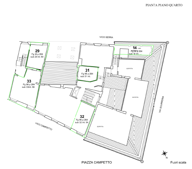 Piano quarto: n. 5 locali con n. 3 soffitte e n. 1 terrazzo, disimpegni, accessori, scale e vuoto ascensore;