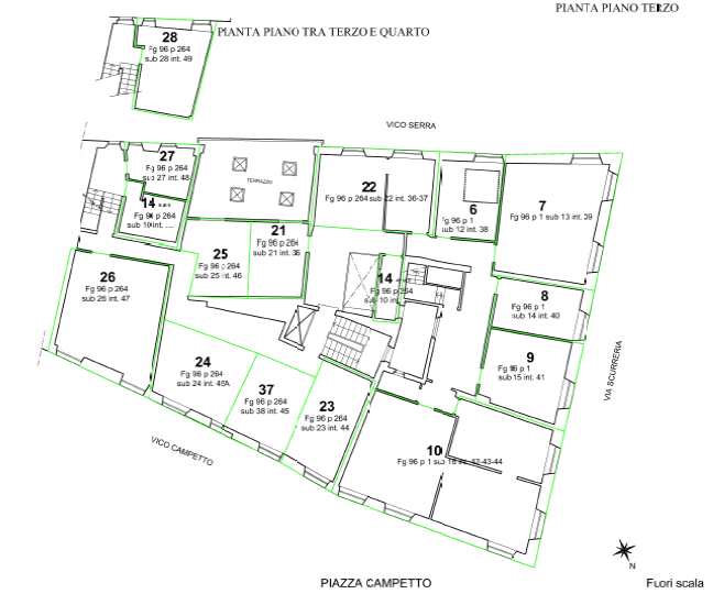 Piano terzo: n. 18 locali con disimpegni e vari accessori diversi, scale e vuoto ascensore, altra scala interna conduce ad un ulteriore mezzanino interposto ai piani terzo e quarto, n. 1 terrazzo;