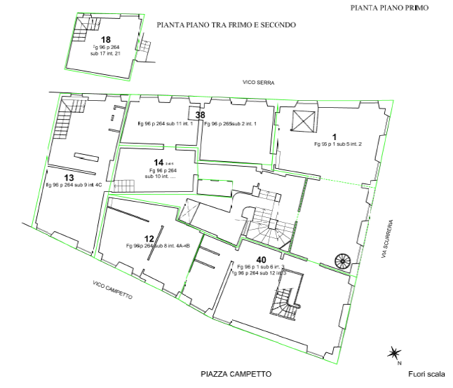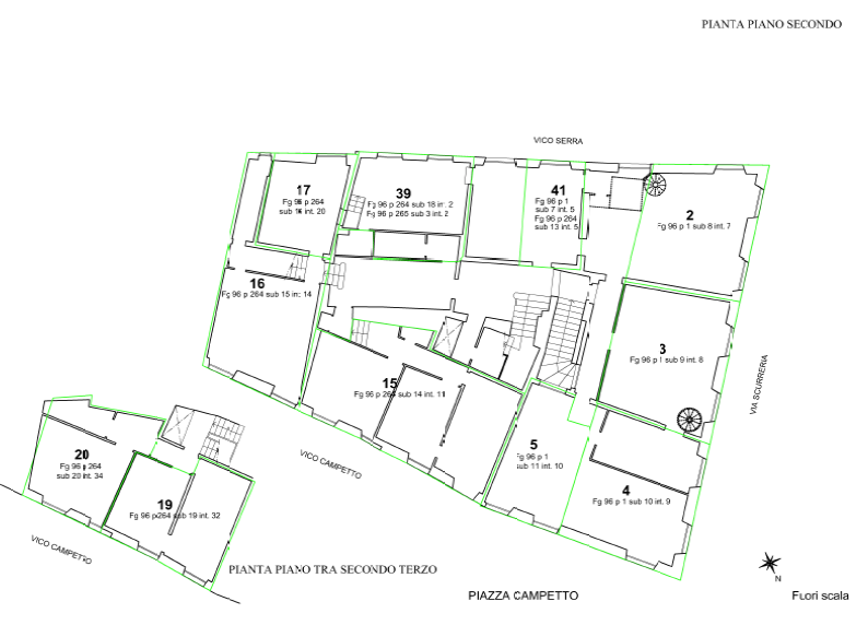 Piano ammezzato interposto ai piani secondo e terzo: n. 3 locali con disimpegno, scale e vuoto ascensore;