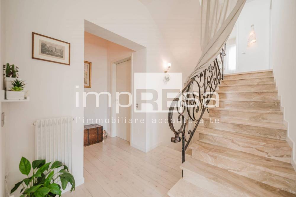 Una scala in marmo con corrimano in ferro battuto ci porta al piano rialzato, dove abbiamo una grande camera matrimoniale di 20mq, una camera doppia di 12mq e un bagno finestrato con vasca di 6mq.