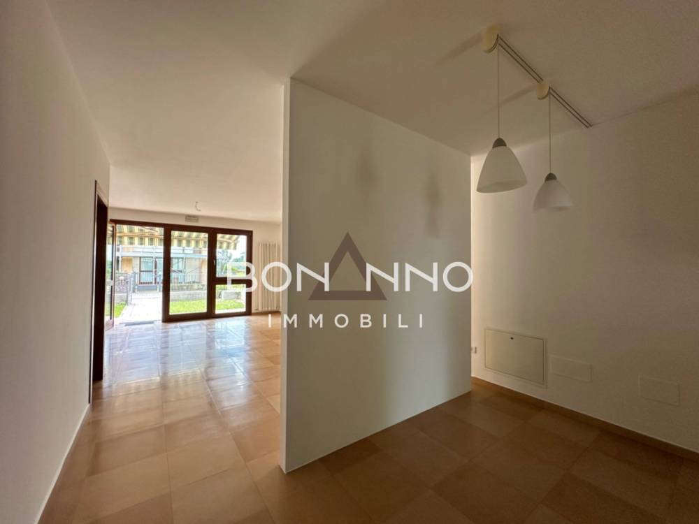 piano terra con giardino privato all'entrata, luminosa zona giorno semi-separata dalla cucina affacciata al portico esterno che si trova nella parte posteriore dell'immobile ed un bagno finestrato.