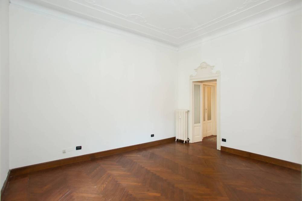 Lappartamento si apre su un ampio ingresso che separa con eleganza la zona giorno dalla zona notte. La zona living è composta da un doppio soggiorno spazioso, valorizzato da soffitti alti e fregi decorativi originali, una sala da pranzo, quattro camere di cui una attualmente adibita a studio o biblioteca due bagni e una cucina abitabile.