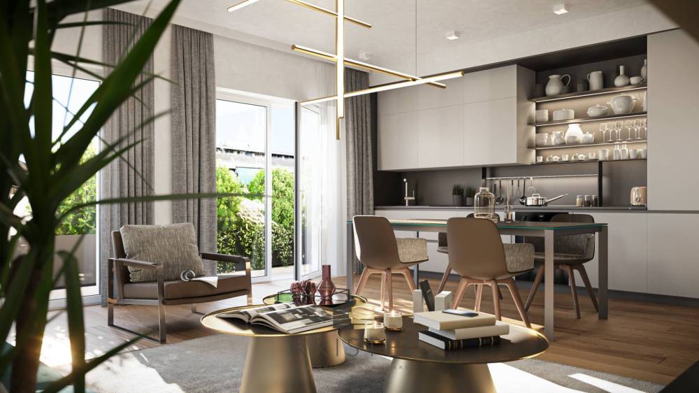 E' composto da un luminoso living che può essere arredato con una funzionale cucina a vista completa di tavolo da pranzo ed un accogliente salotto con area tv.
