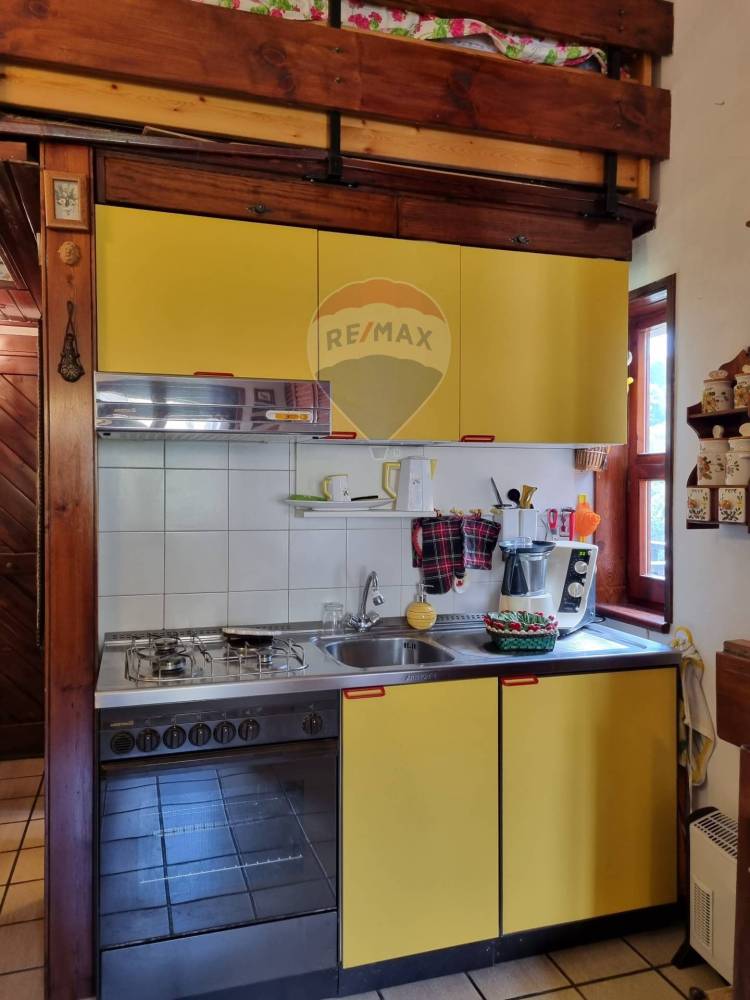 Ingresso in soggiorno con caminetto, angolo cottura, bagno con piccola finestra .Soppalco, alto ed abitabile, adibito a cameretta da letto con finestra.
