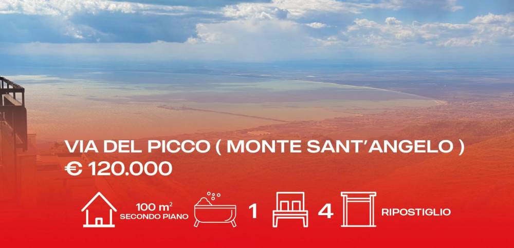 100 metri quadri al secondo piano, con scale comode e uscita su un balcone che regala un panorama mozzafiato sul Golfo di Manfredonia e sul centro storico di Monte SantAngelo.
