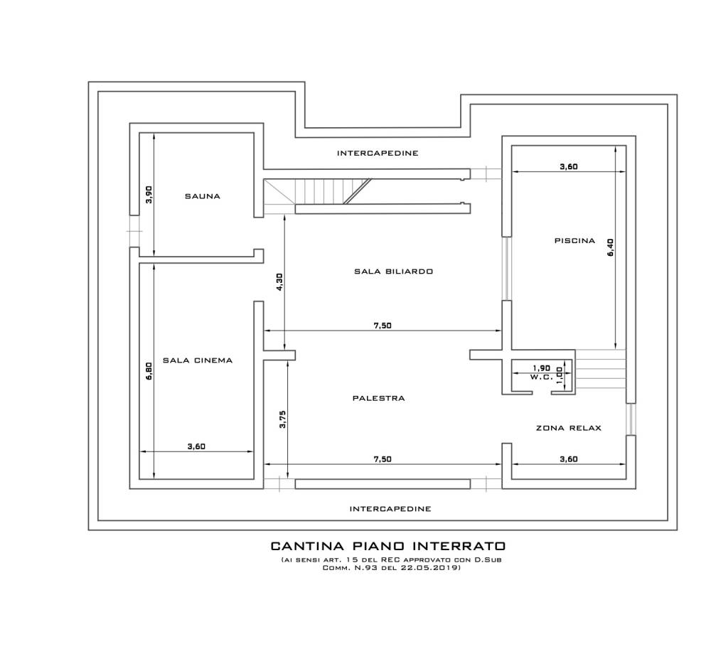 Piano interrato con sauna, sala cinema, zona relax e piscina interna.