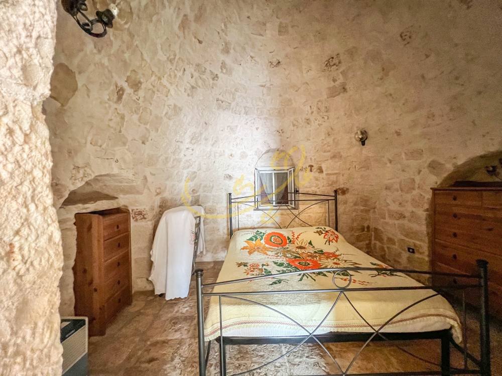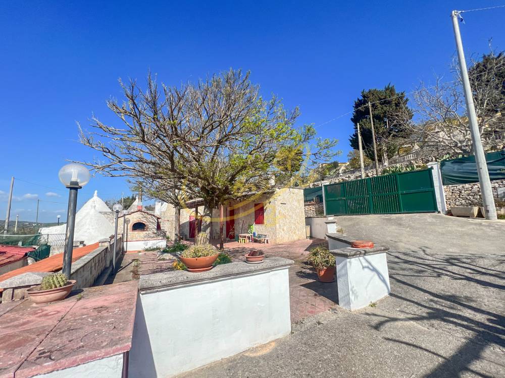 Tramite un cancello si accede al piazzale con vista panoramica sulla valle, la zona esterna è attrezzata con grande forno a legna e barbecue. Tramite l'ingresso principale si accede alla lamia, con piccolo soggiorno con camino e angolo cucina, una piccola camera da letto e bagno con doccia, il trullo molto ampio, con pavimento in chianca originale, accoglie la camera matrimoniale e un disimpegno che lo collega alla lamia. La casa si trova vicino ad altre abitazioni, ottimo investimento per villeggiatura estiva.