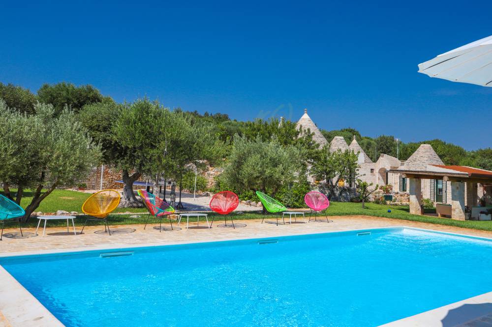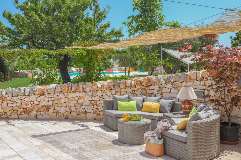 I trulli sono circondati da prato inglese ove ubicato un pergolato in legno attrezzato con area relax con divani, tavolo da pranzo, barbecue, lavabo, frigo bar.