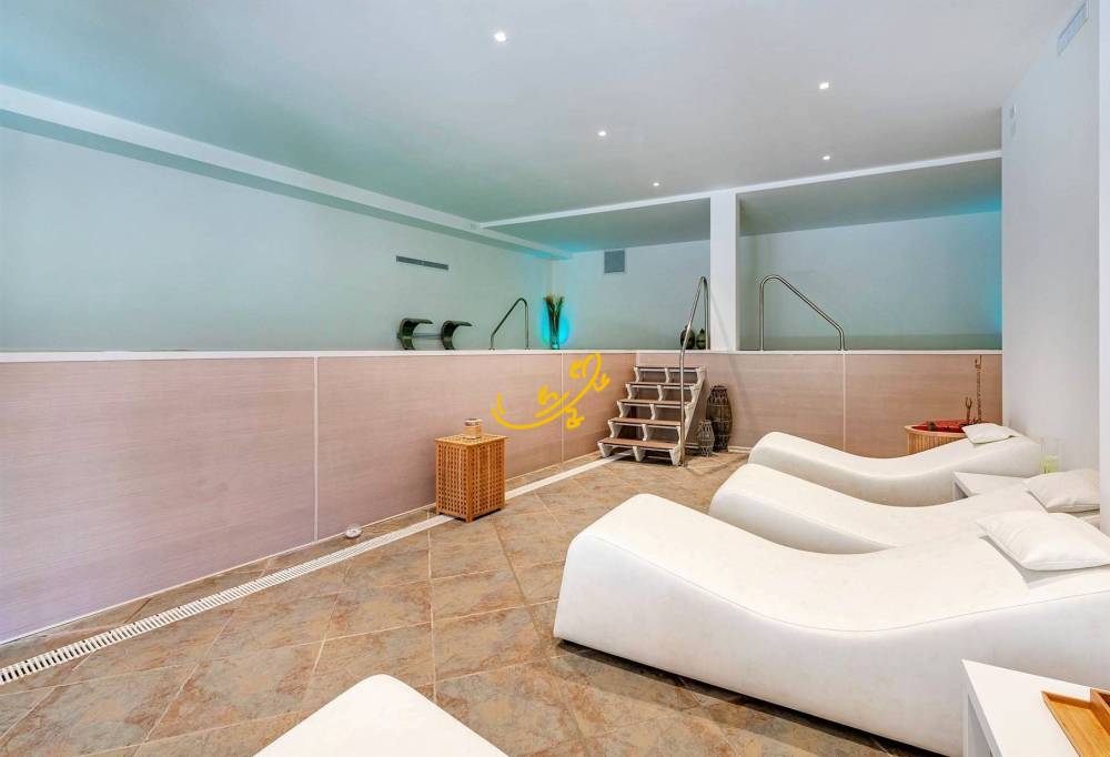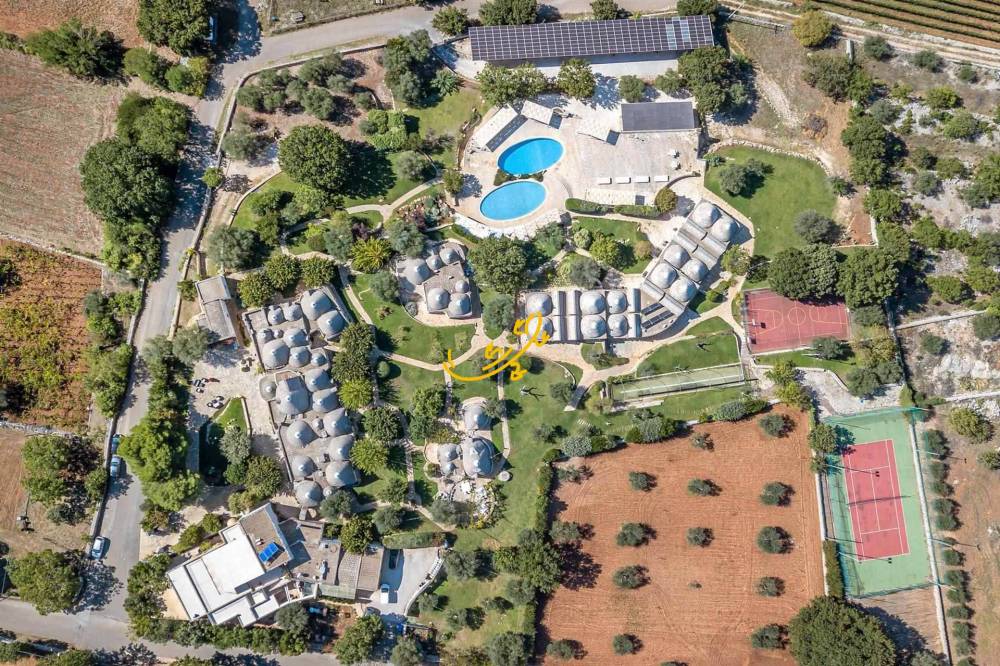 Essa comprende un ristorante con 150 posti e cucina esaurientemente attrezzata, con ampia dispensa, spogliatoi e bagni distinti uomo-donna per il personale, ingresso di disimpegno e servizi per disabili; una sala riunioni capace di ospitare fino a 120 persone; due piscine esterne con illuminazione notturna, scavate nella roccia, una delle quali fornita di impianto idromassaggio, nel contesto di una grande terrazza-solarium con vista panoramica; campo da tennis recintato e provvisto di illuminazione notturna, parcheggio dedicato e ingresso autonomo; campo polivalente da pallacanestro e volley anchesso recintato e fornito di illuminazione notturna; campo da bocce con illuminazione notturna; struttura spa, con bagno turco, piscina per idromassaggi, vasca per talassoterapia, zona massaggi, sauna, sala scrub, fango terapia, spogliatoi e bagni, divisi in sezioni per uomo e donna; quattro parcheggi interni con cancelli autonomi, telecomandati e videosorvegliati; area esterna per giochi per bambini; giardino attrezzato con sentieri in pietra illuminati, ampio piato inglese interamente irrigato e impreziosito da alberi secolari dulivo, querce antiche e piante ornamentali. Gli ambienti sono forniti di riscaldamento con impianto di ultima generazione alimentato altresì da pannelli solari.
