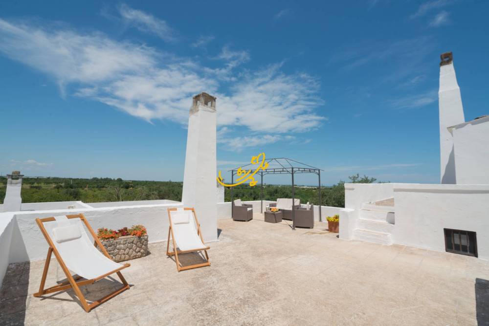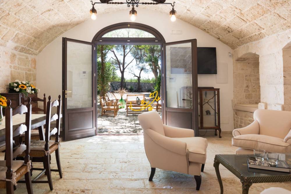 La masseria si sviluppa su circa 700 mq interni, circondata da 12.000 mq di uliveti e giardini mediterranei e ciliegeti. Al piano terra, ampia cucina con zona pranzo e due ampi living con volte a botte con un grande camino, e bagno. Lo spazio dialoga con lesterno, dove la piscina è incorniciata da alberi secolari, aree barbecue attrezzate e zone relax ideali per giornate allaperto o eventi privati.