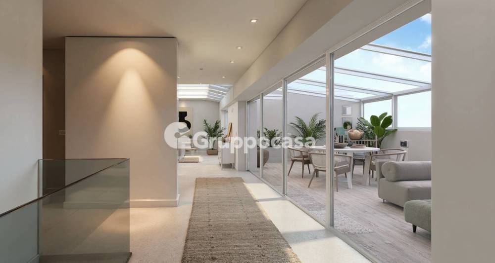 Una scenografica scala interna collega i due livelli dell'appartamento, con ingresso al primo piano e sviluppo al secondo e ultimo piano. L'accesso è ulteriormente facilitato dall'ascensore che arriva direttamente all'interno dell'appartamento.