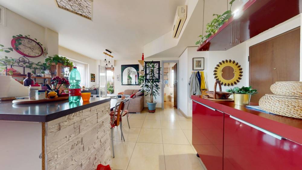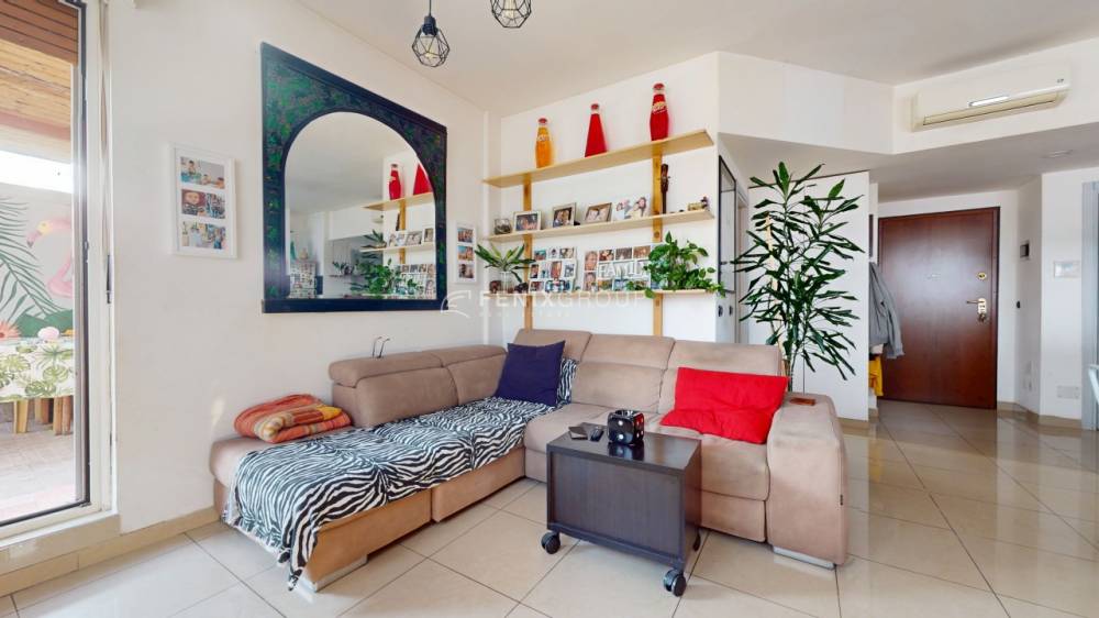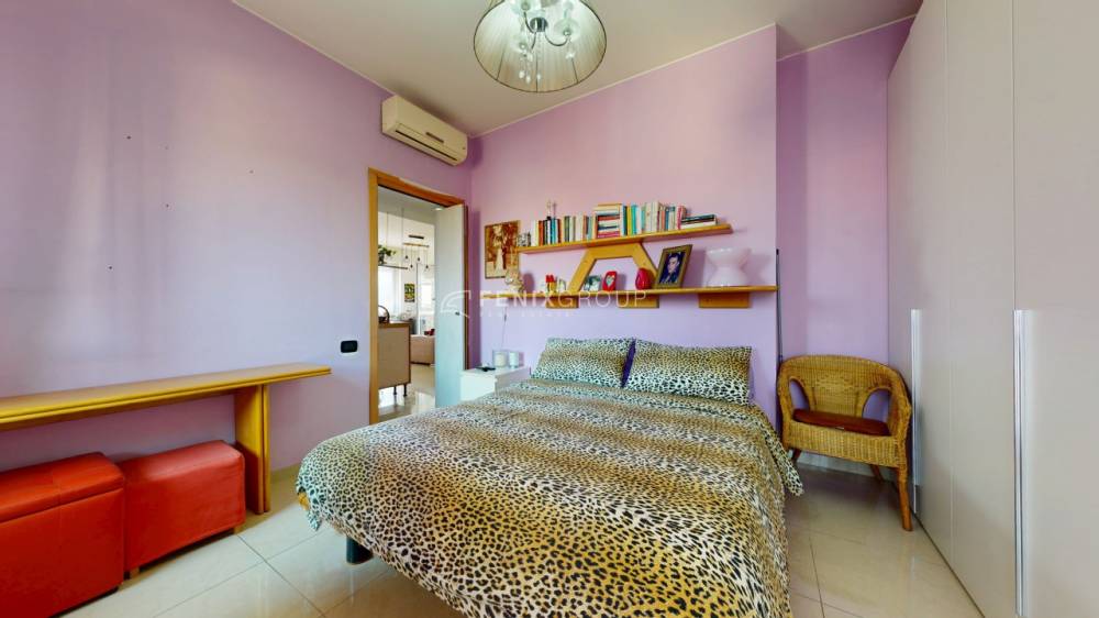 L’appartamento si distingue per una zona giorno ampia e luminosa, con cucina a vista, doppie finestre e porta finestra che conducono a un terrazzo di circa 30mq, coperto con una struttura mobile in legno e impreziosito da una vista panoramica.