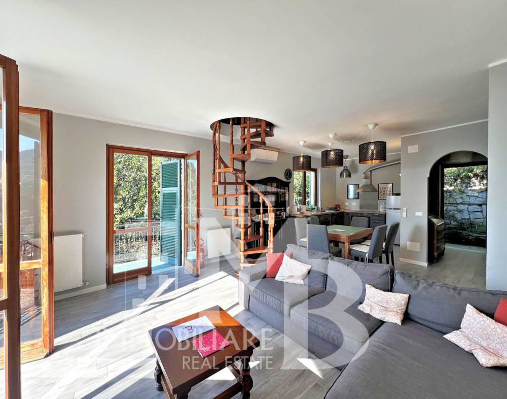 RECCO - Megli - Strepitosa vista mare e promontorio di Portofino- In contesto riservato e tranquillo raggiungibile da strada privata chiusa da cancello elettrico, in piccola palazzina di sole quattro unità abitative proponiamo questo prestigioso immobile avente ingresso indipendente in giardino di proprietà e che si sviluppa su due livelli; al piano d'ingresso troviamo una panoramica e soleggiata zona giorno suddivisa in cucina living e sala pranzo/salotto dal quale si accede alla profonda balconata che regala una vista incantevole sul golfo; un disimpegno che da accesso a due camere e ad un bagno completo e finestrato. Dal salone infine si sale una comoda scala a chiocciola e si raggiunge il piano mansardato adibito a zona notte, dove si trovano due ampie camere dotate di grandi lucernai panoramici ed un ulteriore bagno. Completano la proprietà due comodi posti auto, un box e oltre al giardino/agrumeto adiacente l'ingresso un ulteriore giardino pensile. sopra il box. L'immobile è termoautonomo. Richiesta € 1000.000 compresi box e posti auto Ape G