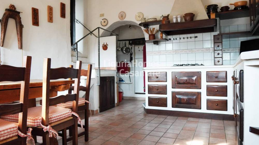 Lingresso della casa in vendita ad Imperia conduce a un accogliente salone caratterizzato da soffitti a volta e dettagli in pietra che richiamano il fascino autentico della tradizione ligure.