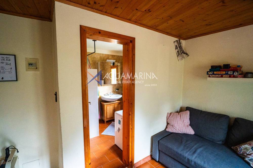 Il piano superiore ospita una camera matrimoniale, un soggiornino con divano, tv satellitare e stufa a legna, ed un bagno con doccia e lavatrice.