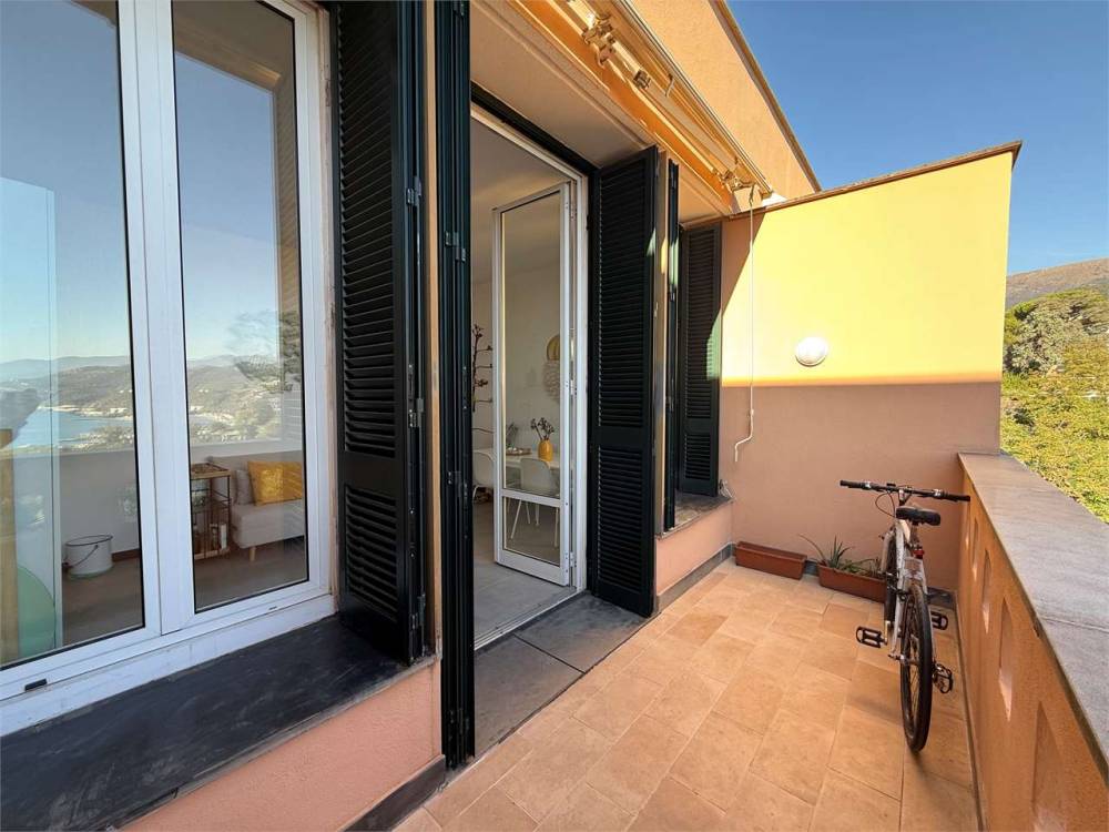 Al piano superiore, raggiungibile tramite la scala comune, si trova la terrazza esclusiva di proprietà di circa 70 mq, soleggiata tutto il giorno e con una vista panoramica sul golfo. In altri appartamenti del condominio è stata realizzata una scala esterna privata, quindi è possibile collegare direttamente la casa al terrazzo, creando un plus di grande valore.