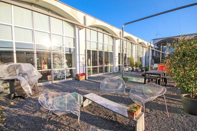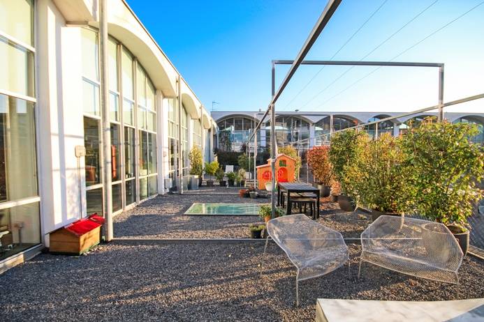 Contemporaneo Factory Loft di pregio architettonico di mq 240 dislocato su 2 livelli dotato di 70 mq di terrazza con giardino pensile e 2 posti auto coperti.