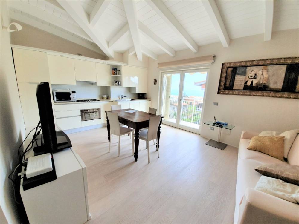 Attico di lusso ad Alassio – Eleganza, comfort e vista mare nella zona più esclusiva della Riviera Nel cuore della zona più ambita di Alassio, in un contesto elegante, silenzioso e di assoluto pregio, sorge questo magnifico attico di 98 mq calpestabili, un vero gioiello architettonico capace di coniugare lusso, raffinatezza e vista mare spettacolare. La posizione è invidiabile: a pochi minuti dal centro, dal mare e dai servizi principali, ma immersa nella quiete e nella riservatezza che solo le aree più esclusive della cittadina possono offrire. Un luogo dove il suono delle onde e la luce del mare diventano parte integrante della vita quotidiana. Una casa che parla di luce e armonia La tripla esposizione regala all’attico una luminosità straordinaria in ogni ora del giorno. Le ampie vetrate a tutta altezza incorniciano la doppia vista mare, offrendo panorami che si estendono dall’isola Gallinara fino al profilo di Capo Mele. La luce naturale entra generosa, esaltando i toni caldi dei pavimenti e i materiali di pregio scelti con cura per ogni ambiente. Il salone principale, ampio e arioso, è il cuore della casa: uno spazio raffinato, concepito per accogliere con eleganza e per vivere momenti di convivialità senza rinunciare al comfort. L’accesso diretto alla terrazza panoramica trasforma il soggiorno in un continuum tra interno ed esterno: la vista mare diventa protagonista, rendendo ogni colazione, aperitivo o cena all’aperto un’esperienza di pura bellezza. La terrazza: un affaccio privilegiato sul mare La terrazza vista mare è uno degli elementi più esclusivi della proprietà. Spaziosa e perfettamente vivibile, è il luogo ideale per godersi il sole, il relax e i colori cangianti del Mediterraneo. Grazie alla posizione elevata e alla tripla esposizione, la privacy è assoluta, mentre il panorama regala emozioni diverse a ogni ora del giorno: l’alba che illumina dolcemente la costa, il tramonto che infiamma l’orizzonte, la sera che si accende di luci lontane riflesse sull’acqua. Zona notte: intimità, comfort e stile La zona notte è composta da due camere matrimoniali spaziose e ben proporzionate, entrambe pensate per offrire quiete e relax. Le camere sono arredate con gusto contemporaneo, arricchite da armadiature su misura e da ampie finestre che garantiscono luce naturale e ventilazione ottimale. L’atmosfera è accogliente e raffinata, perfetta per chi desidera un rifugio privato dove ritrovare equilibrio e serenità. Due bagni finestrati – eleganza e funzionalità I due bagni, entrambi con finestra, sono rifiniti con materiali di altissima qualità: gres porcellanato di grande formato, sanitari sospesi, rubinetterie di design e ampie docce con cristalli trasparenti. Ogni dettaglio è stato studiato per garantire comfort e funzionalità, trasformando anche i gesti quotidiani in momenti di autentico benessere. Finiture e dotazioni di livello superiore L’attico si distingue per finiture di lusso e impiantistica di ultima generazione. Il riscaldamento a pavimento assicura un calore uniforme e discreto, mentre il sistema di aria condizionata integrato consente di regolare la temperatura in ogni ambiente con precisione e silenziosità. Gli infissi a taglio termico, le porte laccate, i pavimenti in legno e i rivestimenti selezionati confermano una cura artigianale dei dettagli. La proprietà viene venduta completamente arredata, con mobili di pregio scelti per valorizzare gli spazi e creare un’atmosfera di lusso contemporaneo, sobrio e accogliente. Comodità e servizi esclusivi Completano la proprietà una cantina privata e un garage doppio sotto casa, collegato direttamente all’attico tramite ascensore. Un comfort raro e prezioso, che aggiunge praticità e valore all’immobile. Il palazzo, di nuova costruzione, è stato realizzato con tecniche costruttive avanzate e una particolare attenzione all’efficienza energetica e acustica, garantendo massima qualità dell’abitare e bassi consumi.