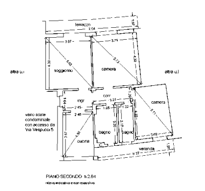 L'alloggio si trova al piano secondo con cantina al piano terra. L'abitazione, inserita in un complesso residenziale che si sviluppa su cinque piani fuori terra (terra, primo, secondo, terzo e quarto), oltre un sottotetto di uso comune utilizzato come ripostiglio. L'unità risulta composta da cucina, luminoso soggiorno, corridoio centrale, due camere, due servizi igienici, terrazzo e veranda. La cantina è accessibile dall'esterno.
