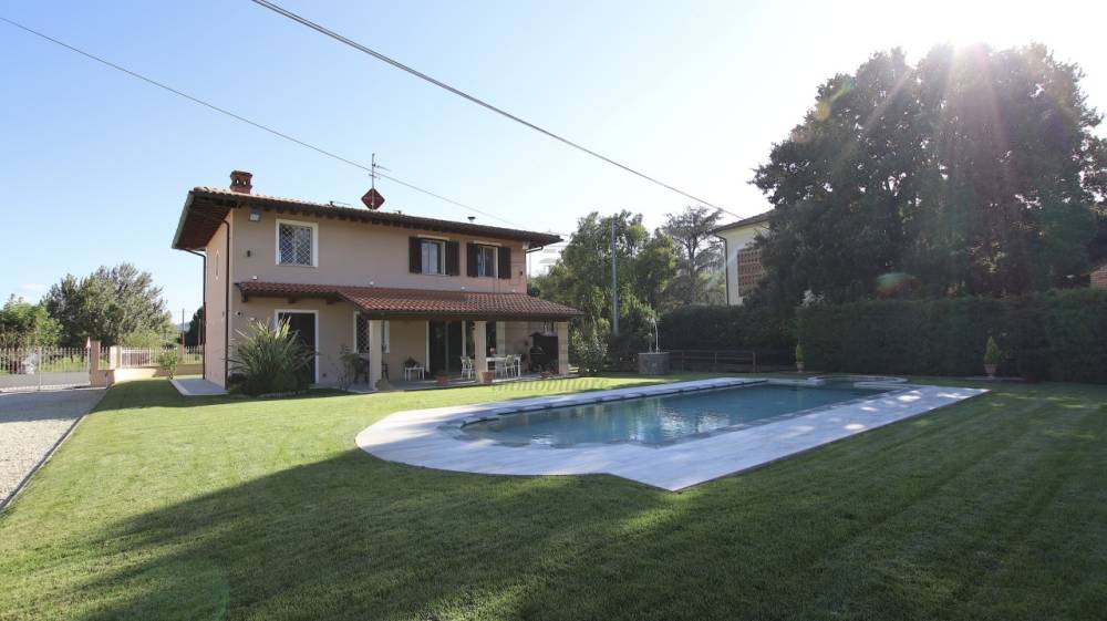 IA04125 - 8 km da Lucca, Villa di nuova costruzione con Piscina a Sfioro. A soli 15 minuti dal centro storico di Lucca, in una zona agricola e riservata, questa villa indipendente di recente costruzione rappresenta una buona soluzione per chi vuole abitare con tutti i comfort moderni. Appartata, ma vicina ai servizi, consente di godere della tranquillità della campagna senza rinunciare alla comodità.L'immobile realizzato su 2 piani si sviluppa all'interno di un bel giardino di 2000 mq interamente recintato. Risulta presente una piscina a sfioro interrata ad acqua salata con vasca idromassaggio. Adiacente, oltre la recinzione della parte a giardino, si trova un terreno di 1200 mq, che può essere disimpegnato e che permette la realizzazione autonoma di una altra villa singola. La composizione è molto razionale ed il design sobrio: Il piano terra si apre su un ampio soggiorno, suddiviso in zona soggiorno con camino e zona pranzo, ideale per i momenti conviviali. La cucina, funzionale e moderna, è separata dal resto della zona giorno, bagno per gli ospiti e ripostiglio. Al piano superiore, camera padronale, dotata di bagno privato con vasca idromassaggio, altre due camere doppie e un secondo bagno. La richiesta è di €.1.100.000 per tutto il complesso. N.B. Per motivi di privacy l'indirizzo pubblicato è approssimativo e non corrisponde alla sua reale ubicazione