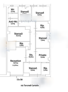 L'unità attualmente adibito a centro estetico, è composta da reception, disimpegno, sei stanze, tre ripostigli e un bagno con antibagno, per una superficie convenzionale complessiva di circa 100 metri quadri.
