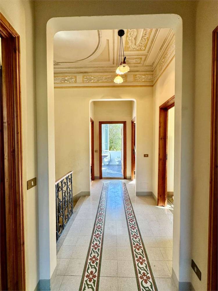 Gli Interni: L'ingresso, leggermente rialzato di tre gradini, si apre su un corridoio che conduce alla zona giorno. Il piano terra ospita una luminosa sala, una sala da pranzo caratterizzata da un suggestivo caminetto e un'ampia cucina abitabile con accesso diretto al giardino. Completa il livello una pratica cantina interna. Salendo al primo piano tramite una scala impreziosita da soffitti affrescati, si raggiunge un pianerottolo con un imponente portone in legno che dà accesso a una splendida terrazza. Questo piano è dedicato alla zona notte, composta da quattro camere matrimoniali, uno studio con terrazzo privato e due bagni con doccia.