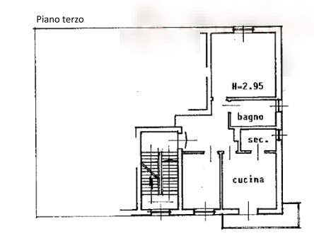 L'unità è posta al terzo piano ed è cosi composta: ingresso/disimpegno, cucina con retro-cucina, bagno, due camere da letto e balcone. Al quarto piano troviamo la soffitta e al piano interrato il locale cantina.