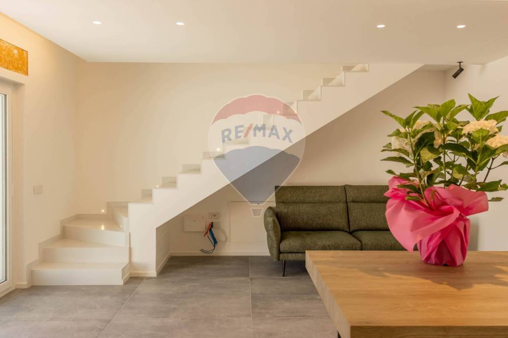 Entrando in casa la grande vetrata affacciata sul verde è la protagonista del soggiorno, in diretto contatto con la luminosa cucina abitabile che allesterno propone un maxi patio circondato da alberi e cespugli fioriti. Tornando allinterno il disimpegno nasconde il bagno ospiti e poi la scenografica scala con cui si raggiunge la riservata zona notte al primo piano che propone due camere da letto, studiolo e bagno.