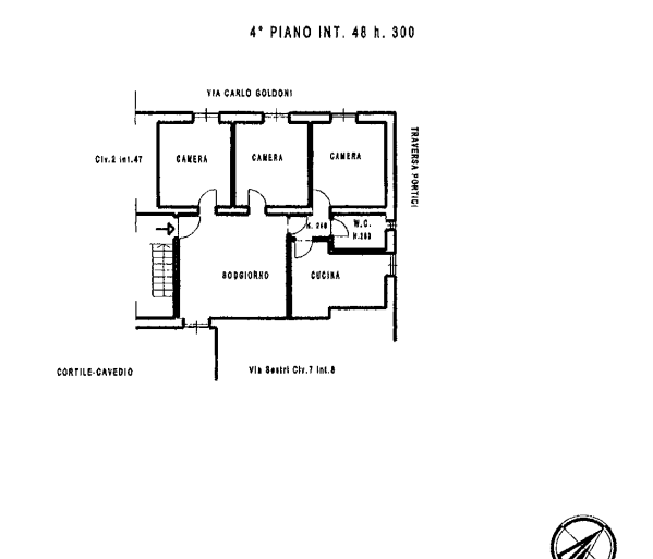Appartamento sito in Genova, Via Carlo Goldoni 2/48, posto al quarto piano, composto da ingresso/soggiorno, dove è stato realizzato un ripostiglio, tre camere da letto, cucina e bagno.