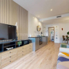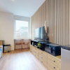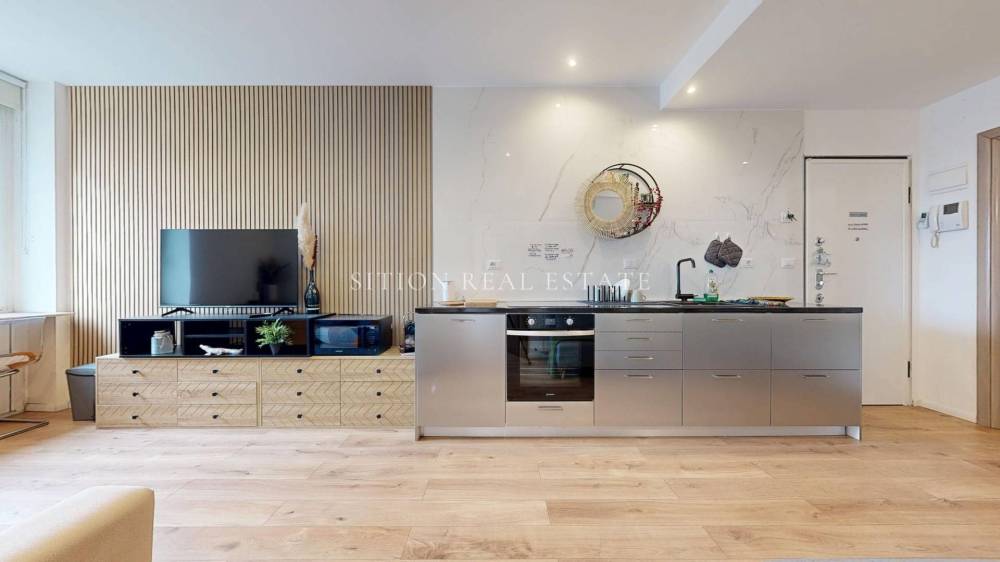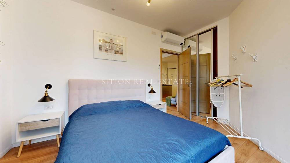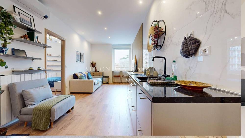 Lingresso conduce a un luminoso soggiorno impreziosito da arredi di design e da una cucina a vista moderna e attrezzata, che si integra armoniosamente con la zona pranzo. La camera da letto, ampia e accogliente, ospita una capiente armadiatura realizzata su misura. Il bagno, curato nei minimi dettagli, è dotato di box doccia e rifinito con materiali di pregio.