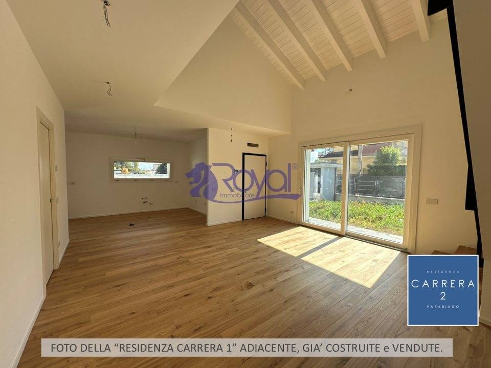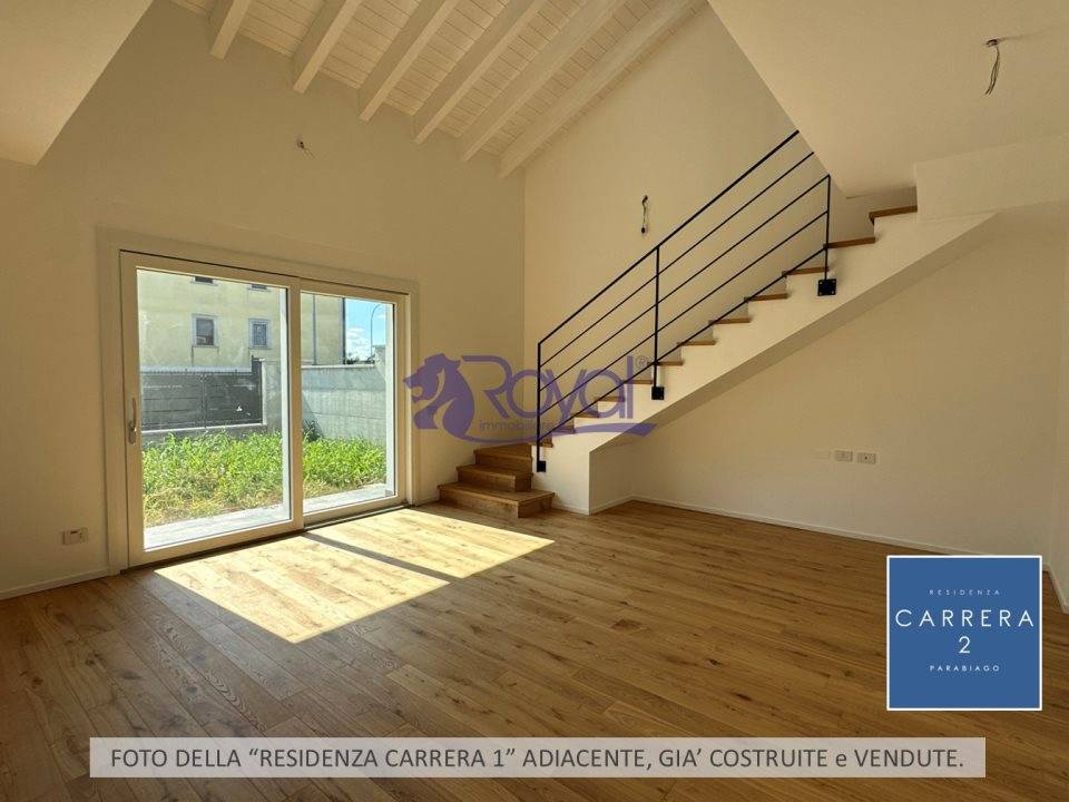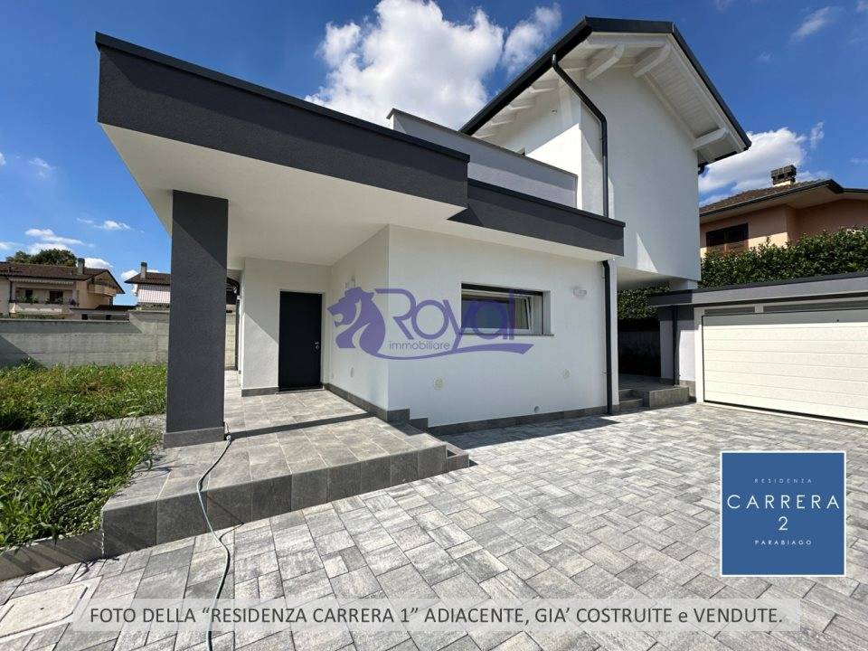Posta nella zona residenziale più signorile e richiesta di Parabiago, villa di NUOVA COSTRUZIONE, ad alta tecnologia costruttiva classificata nella più ALTA CLASSE ENERGETICA A4! L'abitazione, con finiture interne da personalizzare, è di grande metratura, si suddivide su due piani, per un totale di 140 mq così composti: piano terra di 88 mq dove la favolosa zona living, cuore di ogni casa, è resa in questa soluzione ancor più importante e particolare per la doppia altezza che le dona eleganza e modernità, oltre a trasmettere senso di spazio e luce; l'abitazione prosegue con una grande cucina abitabile, che è possibile mantenere a vista per una continuità della zona giorno mantenendo lo stile moderno oppure dividerla in modo più tradizionale dandole più privacy, scelta lasciata liberamente all'acquirente; al piano vi è anche una spaziosa camera matrimoniale, una zona adibita a lavanderia ed il primo bagno. Il piano primo di 52 mq, mansardato travi in legno a vista è ABITABILE, molto particolare la scala a vista che conduce al soppalco che precede la zona notte, dove troviamo una cameretta con balcone, il secondo bagno e la seconda camera matrimoniale di generosa metratura dotata di terrazzo! Il giardino di 190 mq, oltre ad un porticato di altri 13 mq, è distribuito sui tre lati della villa, è da sottolineare l'assoluta riservatezza della zona esterna retrostante della casa ideale da sfruttare per momenti di convivialità in famiglia o con amici in totale privacy. La costruzione progettata per assicurare un altro risparmio energetico, grazie all'impiego di materiali innovativi e di impianti tecnologici di ultima generazione, tra cui serramenti ad alto isolamento termico ed acustico, impianto di riscaldamento a pavimento mediante pompa di calore 100% elettrico, impianto fotovoltaico privato di ben di 5 kW/h, impianto elettrico predisposto per smart domotica, oltre predisposizione di climatizzatore e allarme. Il box doppio in larghezza con basculante sezionale motorizzata. La villa è da personalizzare nella scelte di finiture quali pavimenti, rivestimenti e porte interne. * LE FOTO DELLA VILLA ULTIMATA FANNO RIFERIMENTO ALLA RESIDENZA CARERRA 1 (POSTE A FIANCO) DI STESSA TIPOLOGIA E METRATURA, GIA' COSTRUITE e VENDUTE. SONO STATE PUBBLICATE a TITOLO di ESEMPIO.nMappa - Maggiori Dettagli: Porta blindata, Cucina Abitabile