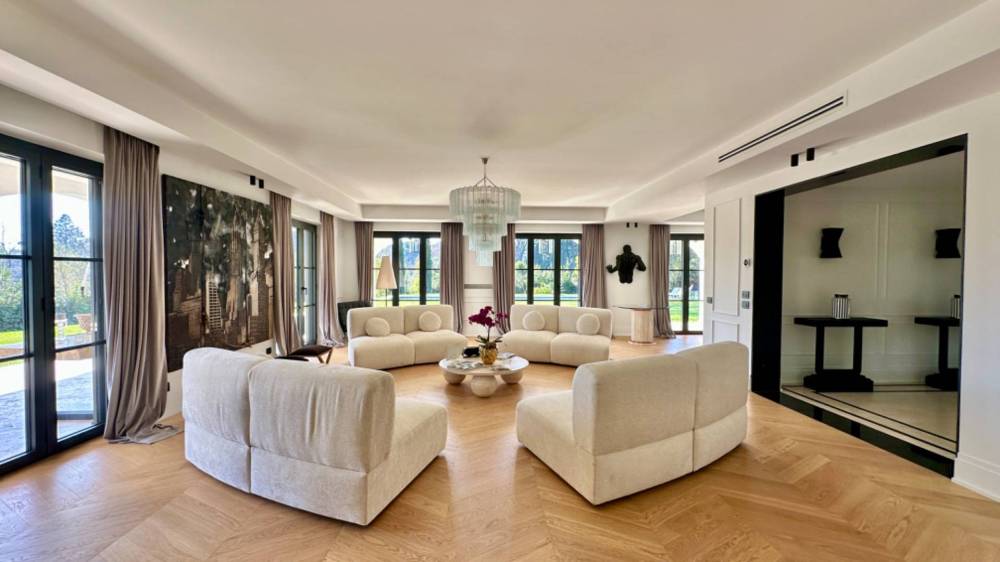 L'accesso alla proprietà avviene attraverso un elegante viale di cipressi, che conduce all'ingresso principale al piano terra. Qui, un ingresso accogliente ci introduce a un ampio salone suddiviso in diverse zone: soggiorno, area conversazione ed un ulteriore area living, arricchita da una parete attrezzata in boiserie con al centro un grande camino in marmo. L'ambiente è inondato di luce naturale grazie a ben sette porte finestre che si aprono sul patio, creando una continuità visiva con il parco e la piscina, offrendo una scenografia bucolica ideale per momenti di relax.