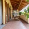 Ampio e luminoso soggiorno con affaccio su portico e giardino piantumato.