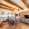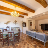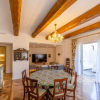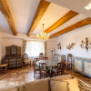 Il soggiorno accoglie con unatmosfera calda e raffinata, arricchita da travi in legno a vista, pavimenti in parquet decorato e arredi in stile classico toscano, con elementi artigianali e lampadari in cristallo. La cucina, moderna e funzionale, si integra perfettamente con lo stile elegante della casa.