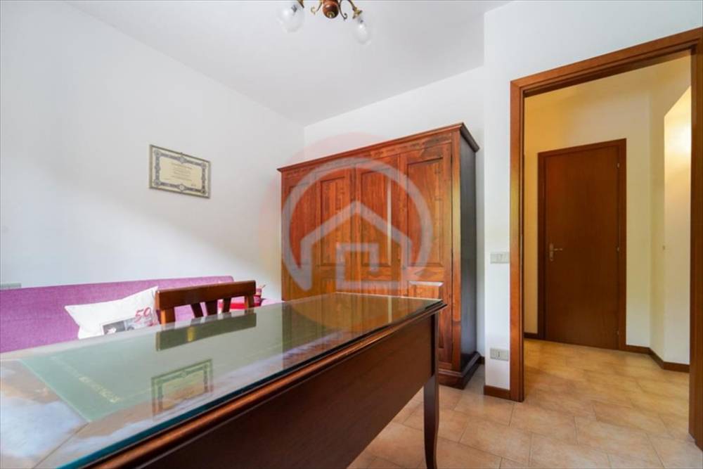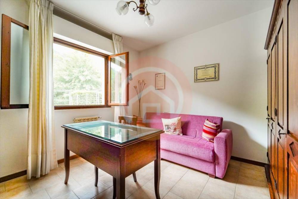 Proseguendo, troviamo una camera da letto accogliente che può essere utilizzata come studio e un bagno completo, rendendo il piano terra pratico e comodo per le esigenze quotidiane.