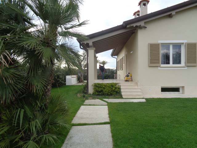 Forte dei Marmi Villetta di recente costruzione con giardino di mq.1000, composta da ingresso, sala pranzo, soggiorno, cucina, camere 3, bagni 2, porticato, impianto d'allarme, aria condizionata, dista 1500 metri dalla spiaggia