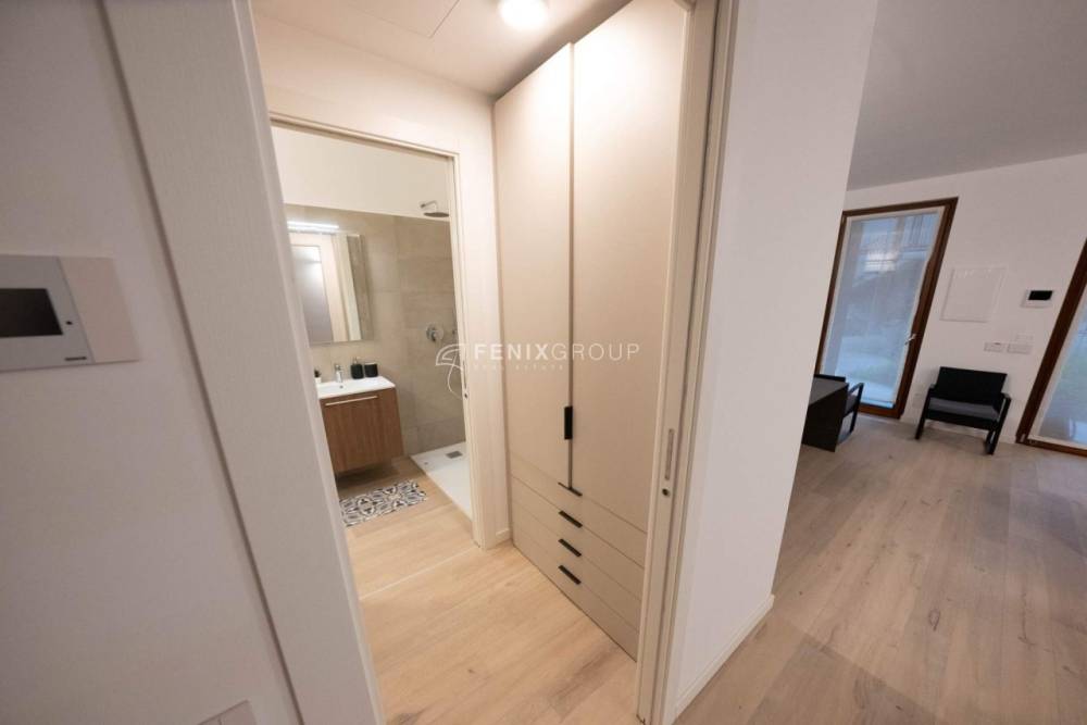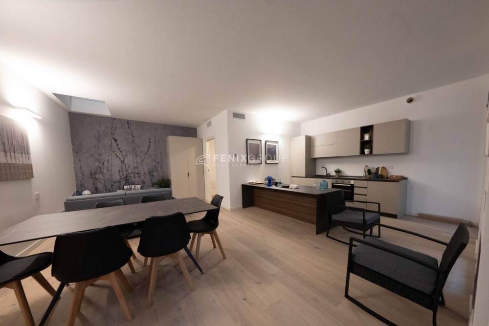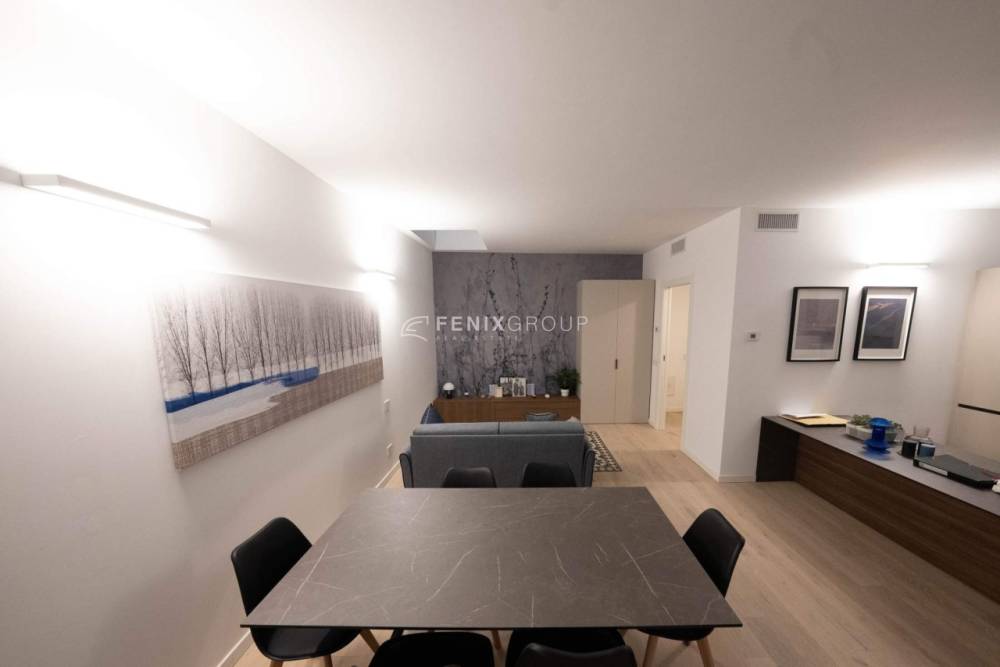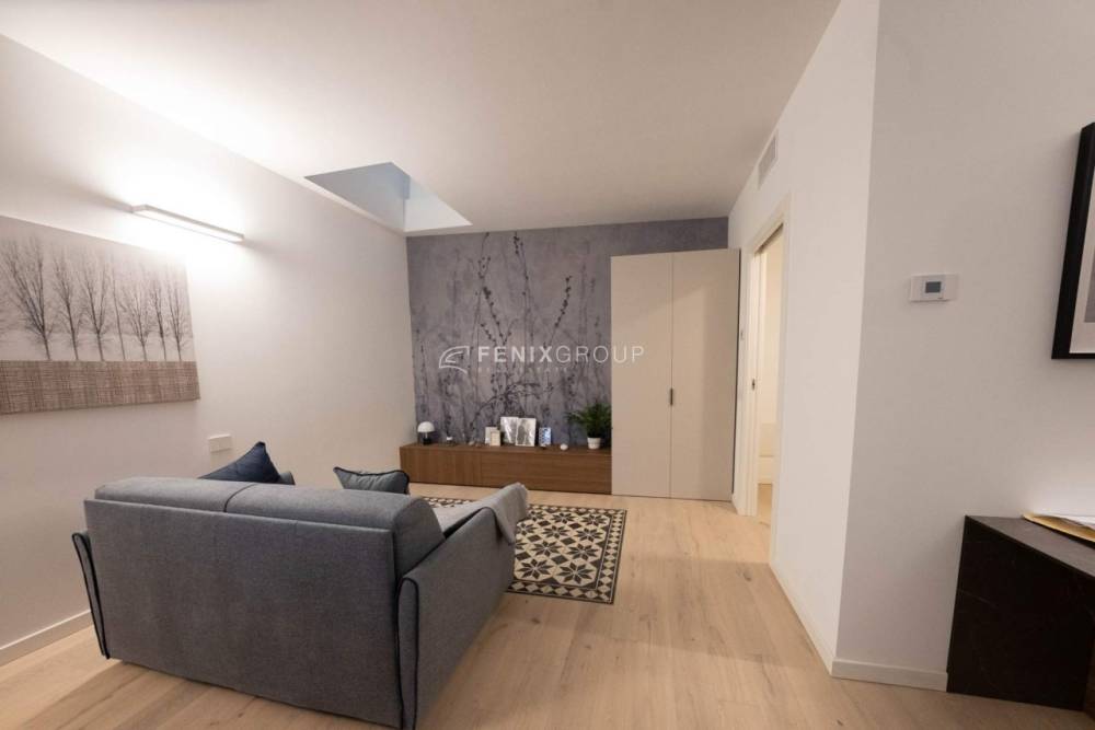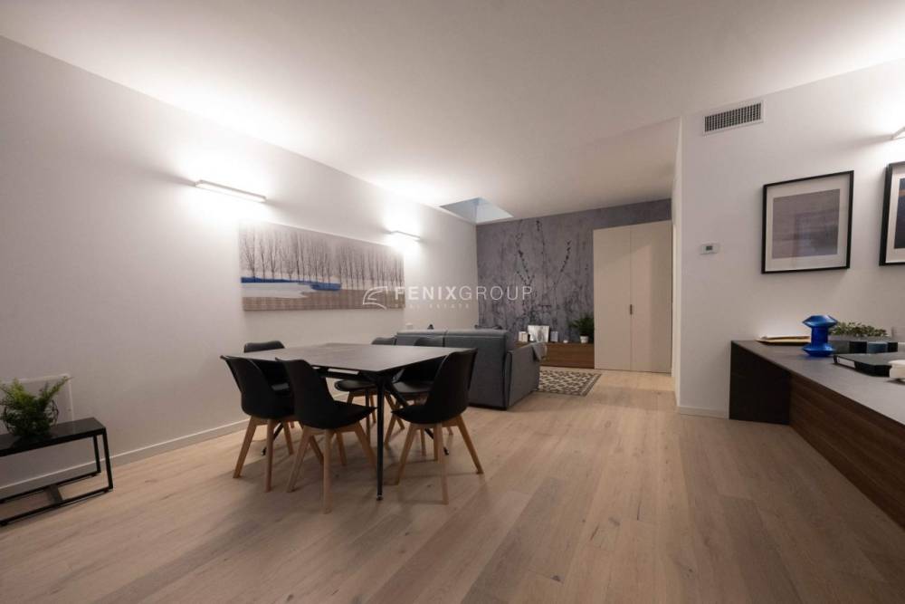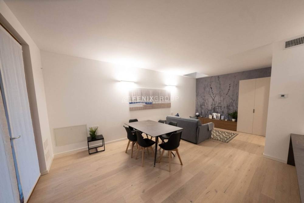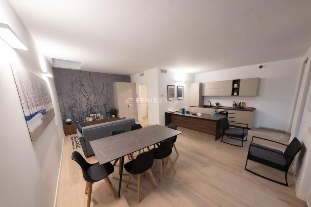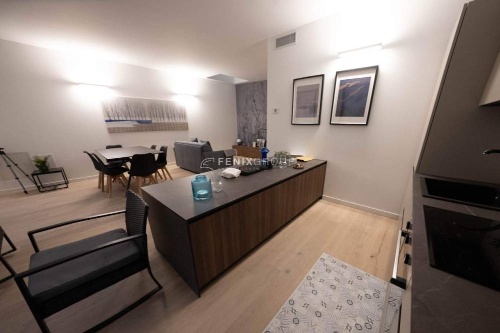 La zona giorno dispone di una cucina a vista con penisola e affaccio diretto sulla veranda privata grazie alle ampie porte finestre che donano luce naturale per tutto il giorno.