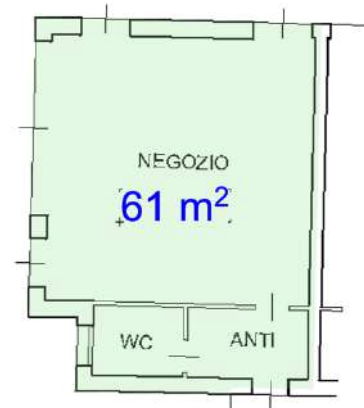 Trattasi di un negozio al piano terra costituito da un unico locale con tre vetrine su due lati e porta, oltre ad ingresso secondario-antibagno e bagno finestrato.