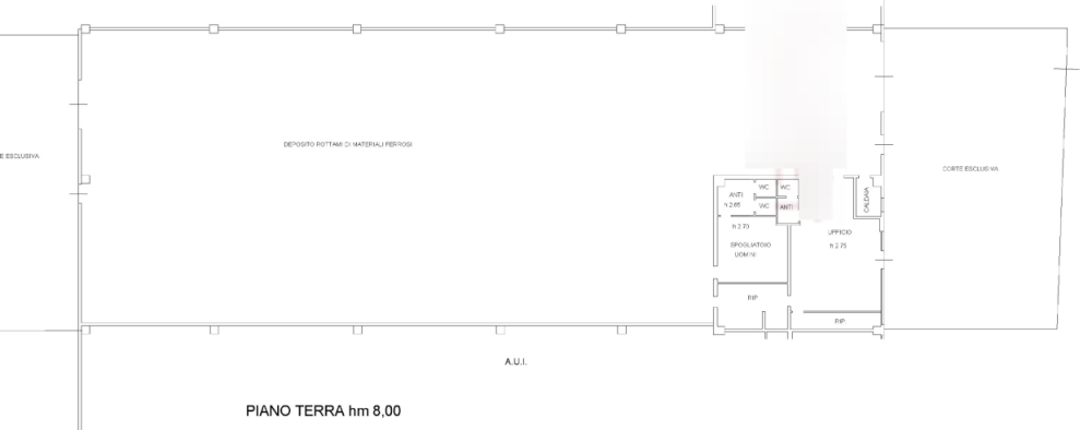 Trattasi di un capannone al piano terra composto da un ufficio, locale caldaia ripostigli, tre w.c., due antibagni, spogliatoio, locale deposito e corte esclusiva di 42,13mq.